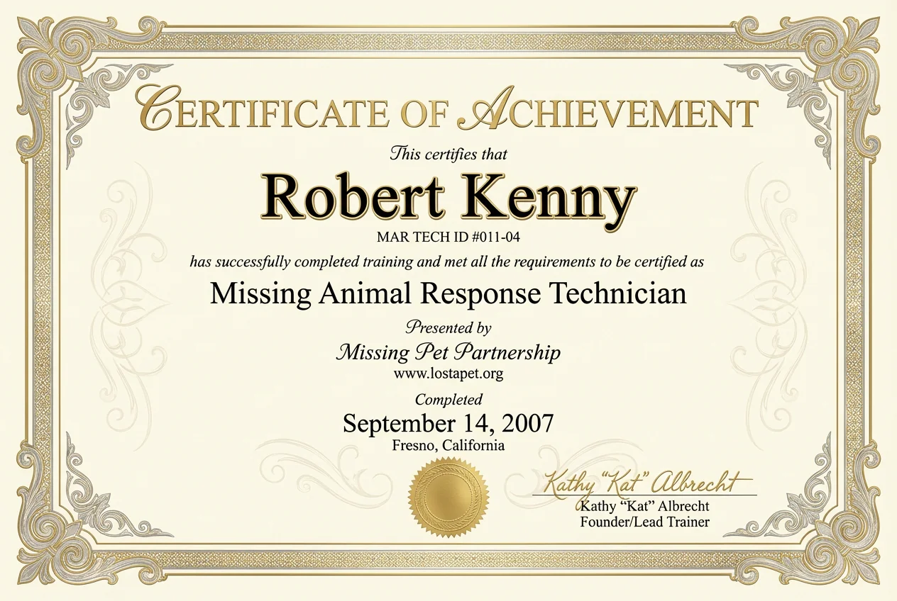 Certified M.A.R. (Missing Animal Response Technician) qualified Fresno, California, USA 2007).